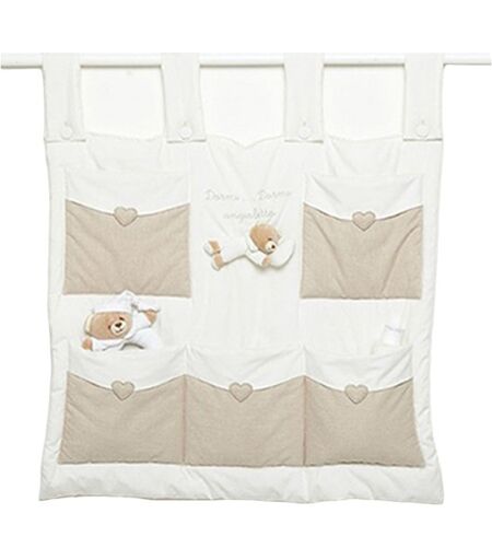 Il pannello della collezione Tato e un comodissimo portaoggetti con ricamate cinque comode tasche, in cui introdurre tutto il necessario per la nanna e la quotidianeita del tuo bebe. Utile per tenere sempre in ordine la cameretta, il pannello e facile al lavaggio, avendo una composizione di puro cotone. Puo essere appeso al muro, sorretto dallapposita asta, oppure al lettino del bimbo, per avere sempre tutto a portata di mano. Dimensioni: 60 x 65 cm Composizione: 100% puro cotone. ...