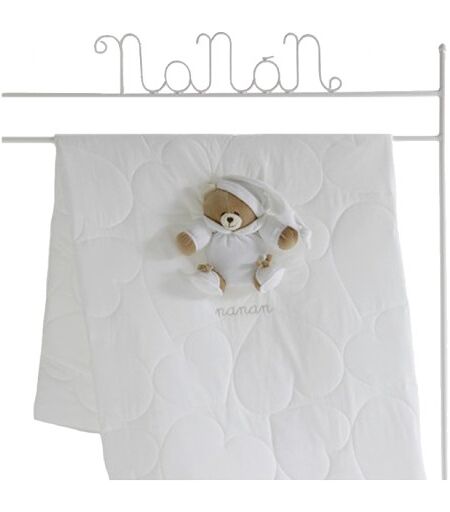 Copertina lettino invernale Tato La copertina Nanan della collezione Tato e ideale per i mesi piu freddi per tenere al caldo il bebe nel suo lettino. Composta da morbidisimo jersey di cotone di colore bianco e facile al lavaggio e alla pulizia, impreziosita da cuori ricamati su tutta la copertina e dellapplicazione del dolce orsetto Tato. Dimensioni: 100x150cm ...