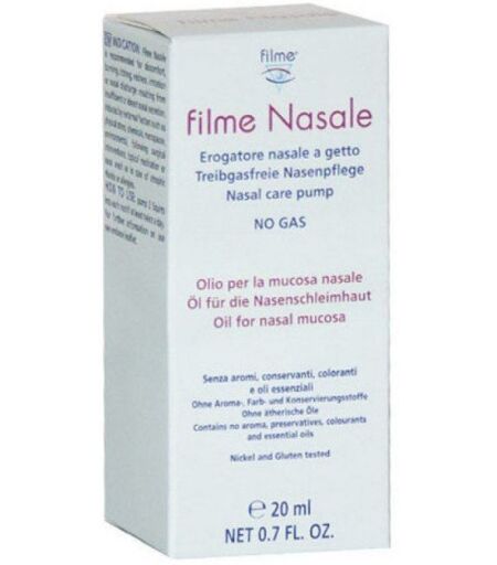 FILME NASALE - Descrizione Olio a base di tocoferolo acetato con erogatore a getto. Dispositivo medico. Testato al nichel (< 1 ppm) e al glutine (< 10 ppm). Senza gas e senza aromi, coloranti, conservanti e oli essenziali. ...