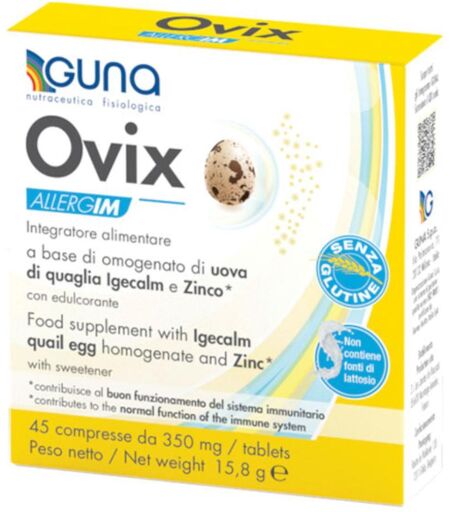 OVIX ALLERGIM - Descrizione Integratore alimentare a base di omogenato di uova di quaglia Igecalm e zinco. Lo zinco contribuisce al buon funzionamento del sistema immunitario. Con edulcorante. - Ingredienti Edulcorante: sorbitolo; omogenato di uova di quaglia Igecalm; agente antiagglomerante: magne… ...