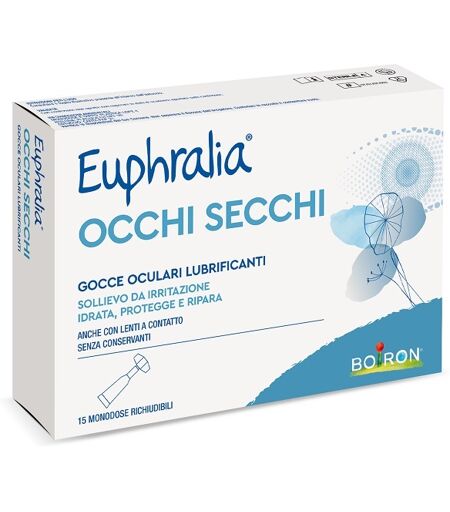 Euphralia - OCCHI SECCHI - Descrizione Soluzione sterile per uso oftalmico con un pH fisiologico, contenente sodio ialuronato e acque distillate di ginkgo biloba, mirtillo, finocchio e centella asiatica e ripartita in pratici contenitori monodose da 0.5 ml, senza conservanti. Il sodio ialuronato co… ...