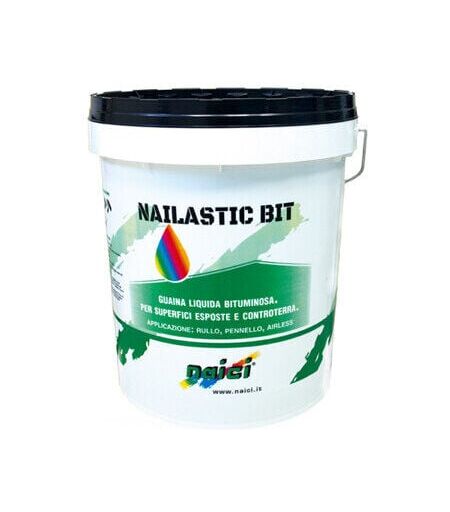 Guaina liquida Nailastic bit guaina liquida impermeabilizzante nera 5 kg nailastic bit viene impiegato per ripristinare vecchie guaine bituminose deteriorate, come impermeabilizzante di tetti spioventi, coperture piane, gronde, muri controterra, fondazioni, giardini pensili, fioriere e come protettivo di sistemi coibentanti in poliuretano. applicabile su qualsiasi supporto edile: cemento, piastrelle, guaine bituminose, vecchie impermeabilizzazioni, legno, ecc.. Caratteristiche Tecniche Nailastic bit è antiradice secondo la normativa cen/ts 14416. resistente ai raggi u.v., antiristagno, pedonabile.: - Tempo di asciugatura: 3 ore a 25°C UR 55%-60% - Temperatura di applicazione: + 5°C + 35°C - Consumo medio finale: da 2 a 2,5 kg/m² in funzione del tipo di supporto - Consumo max per mano: 500 gr/m² ...