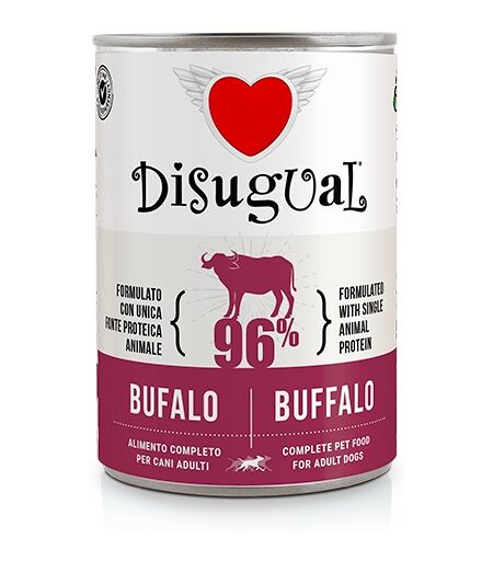 Disugual Bufalo è l'alimento umido completo per il tuo cane adulto, formulato con un'unica fonte proteica animale! INGREDIENTI: BUFALO: bufalo (carne, polmone, fegato) 96%, sostanze minerali, xylosio. ...