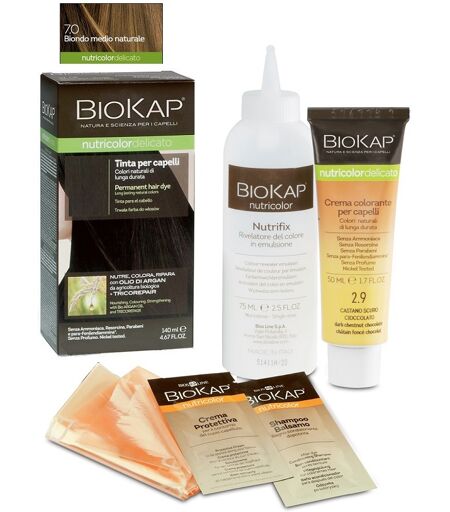 Biokap Nutricolor Tinta Delicato 7.0 Biondo medio naturale - Descrizione La formula a base di ingredienti vegetali e ad alta tollerabilità cutanea nutre e ripara i capelli mentre li colora e copre i capelli bianchi. Complesso Tricorepair a base di proteine del Riso ad azione ristrutturante derivat… ...