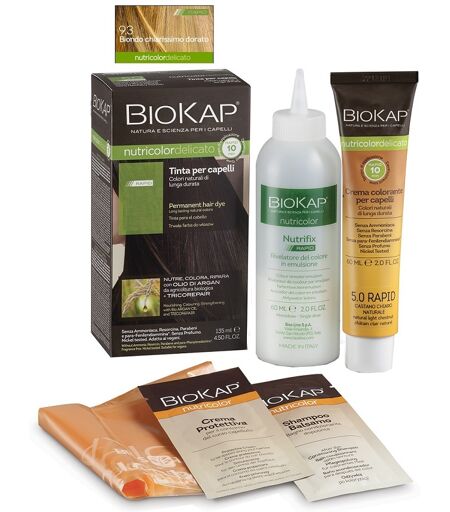 Biokap Nutricolor Tinta Delicato Rapid 9.3 Biondo chiarissimo dorato - Descrizione A base di ingredienti vegetali e ad alta tollerabilità cutanea, nutre e ripara i capelli mentre li colora e copre i capelli bianchi. Complesso Tricorepair a base di proteine del Riso ad azione ristrutturante, derivat… ...