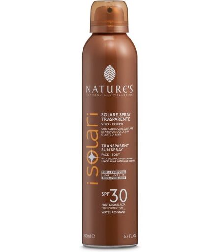 NATURE'S i solari - SOLARE SPRAY TRASPARENTE SPF 30 - Descrizione Una texture trasparente e ultra - sottile che si nebulizza finemente senza lasciare traccia. Si può usare anche sulla pelle bagnata, si spruzza e non è necessario spalmare. La bombola multiposizione permette una rapida applicazione a… ...