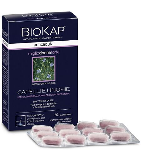 BIOKAP - anticaduta miglio donna forte - Descrizione Integratore alimentare formulato appositamente per la donna con il complesso Tricofoltil, a base di Olio di Lino ricco in Acido Alfa - Linolenico, Rame che contribuisce alla normale pigmentazione dei capelli e Biotina che contribuisce al mantenim… ...
