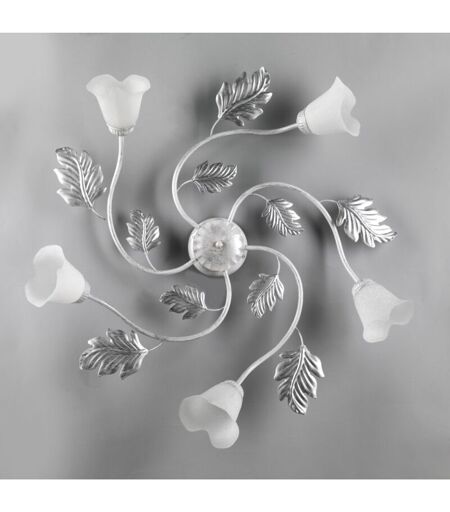 ONLI - Lampadario / plafoniera 5 luci Marilena in metallo bianco spennellato argento. Paralumi in vetro bianco. Prodotto lavorato a mano in Italia. ø