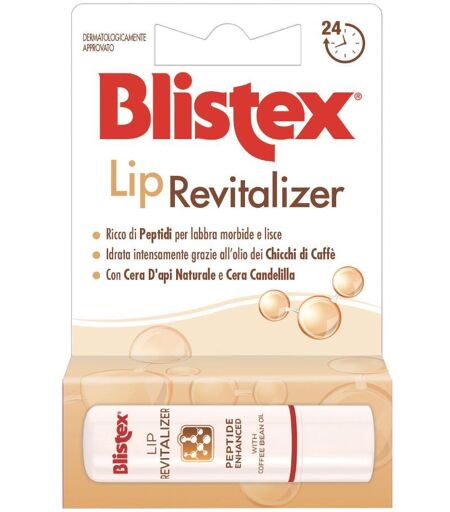 BLISTEX - Lip Revitalizer - Descrizione Ricco di peptidi per labbra morbide e lisce, idrata intensamente fino a 24 ore, grazie all'olio dei Chicchi di Caffè, alla Cera D'api Naturale e alla Cera Candelilla. Dermatologicamente testato. - Modalità d'uso Applicare generosamente e uniformemente tutte l… ...