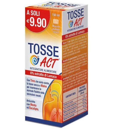 Tosse Act INTEGRATORE ALIMENTARE LIQUIDO CON ESTRATTO DI LUMACA, ESTRATTI VEGETALI E OLI ESSENZIALI. Ingredienti Acqua, Fruttosio, Lumaca (Helix aspersa Muller) estratto 6%, Timo (Thymus vulgaris L. foglie, Glicerolo, Acqua) estratto idroglicerico, Malva (Malva Sylvestris L. foglie, Glicerolo, Acqua) estratto idroglicerico, Monooleato di Poliossietilensorbitano (E433), Eucalipto (Eucalyptus Globulus Labill., foglie) olio essenziale, Menta (Mentha x Piperita L., foglie) olio essenziale, Conservanti: Acido Fosforico (E338), Sorbato di Potassio (E202). Non contiene saccarosio. Modo d'uso Agitare bene prima dell’uso. Si consiglia l’assunzione di 5 ml (1 cucchiaino circa) tre-quattro volte al giorno, puro o diluito in tisane, succhi, latte o altre bevande. La presenza di eventuali precipitati, non è indice di deterioramento ma di naturalità del prodotto. Avvertenze Tenere fuori dalla portata dei bambini al di sotto dei 3 anni. Non superare la dose giornaliera raccomandata. Gli ...