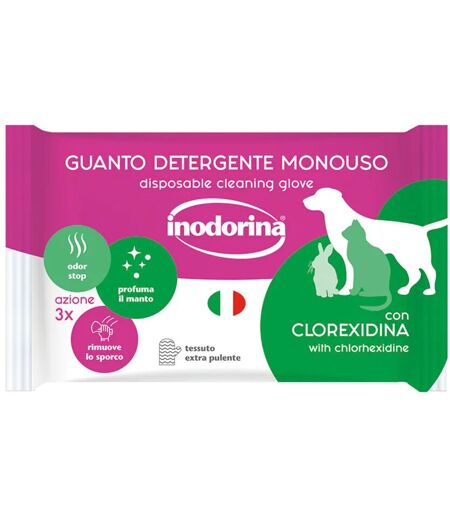 Inodorina Guanto Detergente Umidificato Monouso per Cani Cuccioli e Gatti con Clorexidina