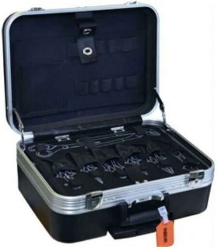 Tipo in ABS con telaio telescopico e 2 ruote Ø 60 mm Design con angoli arrotondati con profilo di chiusura in alluminio Completa di 2 pannelli portautensili con elastici passanti, tasca portadocumenti e portautensili Design con angoli arrotondati e con elastici passanti Pannello superiore con cinghia di trattenimento, tasca portadocumenti e tasche aggiuntive Pannello inferiore completo di passanti su entrambi i lati Fondo portautensili termoformato con divisori mobili completo di 2 astucci estraibili in plastica per minuteria Con 2 piedini di appoggio Maniglia di trasporto ergonomica in ABS con riporto in gomma antiscivolo e targhetta identificativa Serratura doppia a scatto con chiusura a chiave Dimensioni LxPxh 460x330x200 mm Peso 4 kg SENZA UTENSILI Materiale: ABS Colore: Nero ...