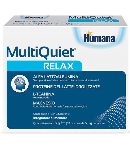 Humana - MultiQuiet - RELAX - Descrizione Integratore alimentare a base di alfa lattoalbumina, magnesio, proteine del latte idrolizzate, L - teanina, vitamina B1, B6, B12 e acido folico. Indicato nei casi di aumentato fabbisogno o ridotto apporto con la dieta di tali nutrienti. Ingredienti Maltodes… ...