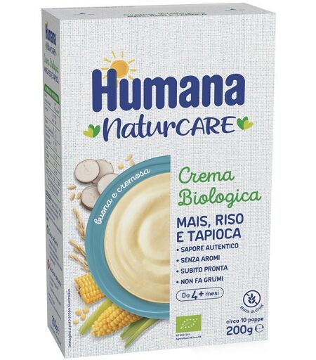 Humana NaturCARE Crema Biologica Descrizione Crema biologica di mais, riso e tapioca. Ingredienti Farina di mais (70%)*, farina di riso (15%)*, amido di tapioca (15%)*, cloridrato di tiamina (vitamina B1). *Da agricoltura biologica. Può contenere soia, latte e lupino. Senza glutine. Caratteristiche nutrizionali Valori medi per 100 g Energia 1.559 kJ/368 kcal Grassi di cui acidi grassi saturi 1,4 g 0,3 g Carboidrati di cui zuccheri 78,6 g 0,2 g Fibre 6,5 g Proteine 7 g Sale 0,08 g Tiamina (vitamina B1) 1,1 mg (220% VNR*) *VNR: Valori Nutritivi di Riferimento Modalità d'uso 1. Scaldare il liquido prescelto. 2. Versare nel piatto il prodotto in polvere e seguire la ricetta. 3. Mescolare fino a ottenere la consistenza desiderata. Imboccare il bambino utilizzando sempre un cucchiaio con punta morbida. Lavare i dentini alla fine del pasto. Seguire attentamente le istruzioni e preparare la pappa subito prima del pasto. Non riutilizzare eventuali ...