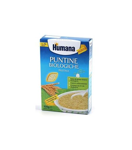 Humana PUNTINE BIOLOGICHE PASTINA • Solo da grano tenero biologico • Cuoce velocemente • Formulati facili da deglutire Prodotto realizzato solo con grano tenero biologico, selezionato ed accuratamente controllato. Sono adatte per iniziare a masticare e ad abituare il bambino a diverse consistenze. Si cuociono velocemente e grazie al formato specificatamente studiato per il tuo bimbo sono facili da deglutire. È priva di coloranti, conservanti e OGM a norma di legge. Contiene glutine. Ingredienti Farina di grano tenero*, vitamina B1. *da agricoltura biologica Valori Nutrizionali Medi per 100 g %RDA* Energia Grassi di cui Acidi Grassi Saturi Carboidrati di cui Zuccheri Fibre Proteine Sale Tiamina (Vitamina B1) 1484 kJ/350 kcal 1,0 g 0,4 g 72,7 g 2,0 g 3,0 g 11,0 g 0,045 g 0,7 mg 140% *Dose giornaliera raccomandata Modalità d'uso In brodo: portare ad ebollizione 200/250 ml di acqua o brodo vegetale o di carne. Versare 1 o 2 cucchiai (1 cucchiaio equivale a circa 12 g) di prodotto. Cuocere per 4 minuti e condire con olio extravergine d’oliva. Asciutta: portare ad ebollizione 500 ml di acqua. Versare 1 o 2 cucchiai (1 cucchiaio equivale a circa a 12 g) di prodotto. Cuocere per 4 minuti, scolare e aggiungere un "Omogeneizzato biologico Humana con carne", cominciando con metà e passando gradualmente all’intero vasetto. Condire con olio extravergine d’oliva. Nota bene: le quantità sono indicative e possono variare secondo l’età, l’appetito del bambino e il consiglio del Pediatra. Conservazione La confezione va conservata in luogo asciutto e lontano da fonti di calore; richiudere accuratamente dopo l’uso. Formato 320 g Cod.94203 ...