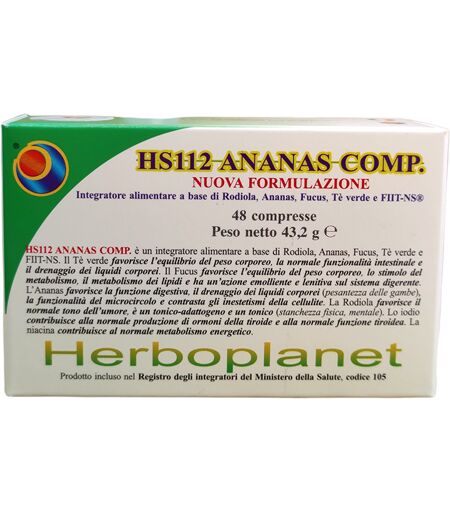 HS112 ANANAS COMP. - Descrizione Integratore alimentare a base di Rodiola, Ananas, Fucus, Tè verde e fiit - ns. Il Te' verde favorisce l'equilibrio del peso corporeo, la normale funzionalità intestinale e il drenaggio dei liquidi corporei. Il Fucus favorisce l'equilibrio del peso corporeo, lo stimo… ...