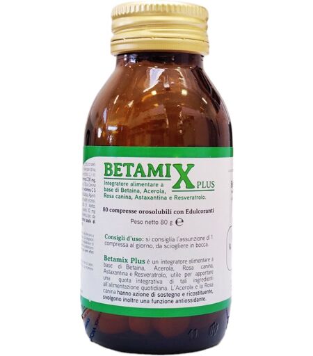 BETAMIX PLUS - Descrizione Integratore a base di betaina, acerola, rosa canina, astaxantina e resveratrolo, utile per apportare una quota integrativa di tali ingredienti all'alimentazione quotidiana. L'acerola e la rosa canina hanno azione di sostegno e ricostituente, svolgono inoltre una funzione … ...