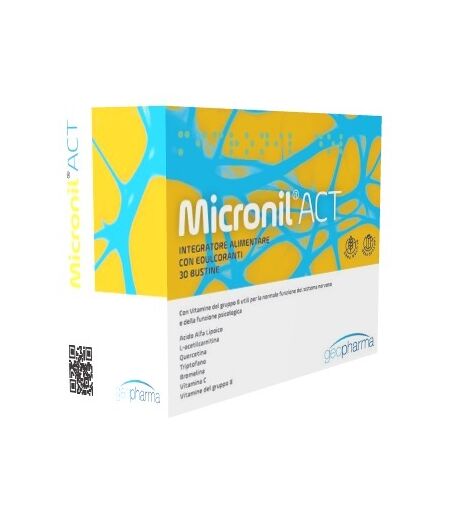 Micronil ACT - Descrizione Integratore alimentare con edulcoranti. Con vitamine del gruppo B, ed in particolare vitamina B1, B2, B6 e B12 insieme alla vitamina C, contribuiscono al normale funzionamento del sistema nervoso ed alla normale funzione psicologica. L'acido pantotenico, Vitamina B5, cont… ...