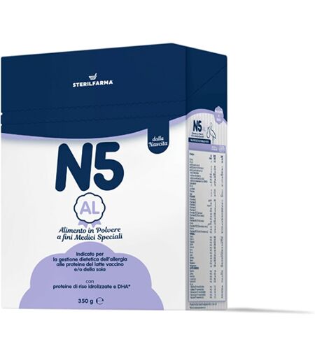 N5 AL - Descrizione N5 AL è un alimento il polvere a fini medici speciali, indicato per la gestione dietetica dell'allergia alle proteine del latte vaccino e/o della soia, ideale dalla nascita. La formulazione di N5 AL è idonea a soddisfare pienamente le esigenze nutrizionali dei lattanti dalla nas… ...