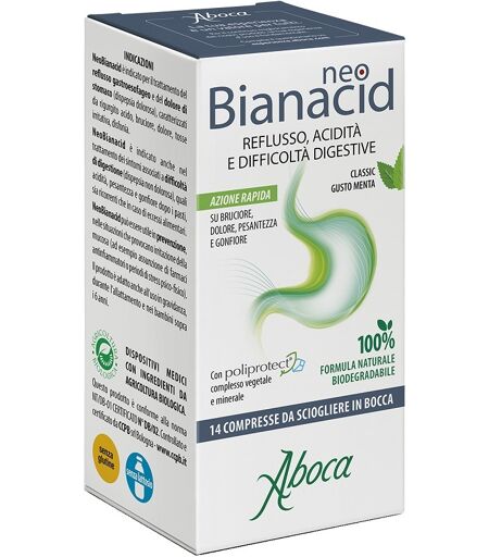 neo Bianacid - Descrizione Dispositivo Medico Classe IIA. NeoBianacid è un prodotto a base di complessi molecolari vegetali e minerali, che svolge un'azione protettiva e lenitiva della mucosa gastro - esofagea, utile per contrastare rapidamente il bruciore, il dolore, la sensazione di acidità, ovve… ...