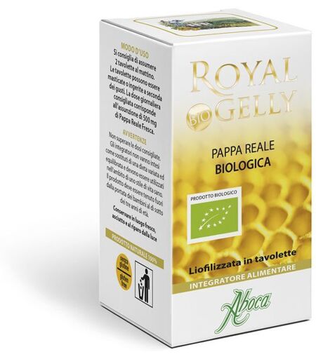 Gli integratori non sostituiscono un’alimentazione equilibrata e variegata e uno stile di vita sano.Dalla Pappa Reale fresca certificata con Metodo di Produzione Biologico, Aboca ottiene Royal Gelly Bio tavolette, un integratore formulato con Pappa Reale liofilizzata senza eccipienti di sintesi (Brevetto Europeo n. 1075830) che assicura il mantenimento delle proprietà originarie della Pappa Reale fresca e la stabilità del prodotto senza la necessità di conservazione in frigorifero.Prodotto incluso nel Registro degli Integratori del Ministero della Salute codice 11644.IngredientiZucchero di canna*, Pappa Reale liofilizzata*, Amido di riso*. *Ingrediente Biologico Quantitativi per dose giornaliera consigliata - 2 tavolette Pappa Reale liofilizzata caratterizzata in 10-Hda (acido 10-idrossidecenoico) ≥4% 160 mg Assunzione consigliata2 tavolette preferibilmente al mattino. Avvertenze: Non superare la dose giornaliera raccomandata. Tenere fuori dalla portata dei bambini al di sotto dei tre anni. Conservazione: Conservare in un luogo fresco e asciutto. Si prega di fare riferimento, se necessario, ad ulteriori istruzioni riportate sulla confezione. Contenuto nettoFlacone da 40 tavolette da 480 mg ciascunaProduttoreAboca Spa Societa' AgricolaLoc. Aboca, 2052037, S.sepolcro, ARItalia ...
