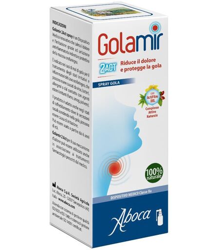 Golamir 2ACT - Spray - Descrizione Dispositivo medico innovativo che calma il dolore e l'irritazione grazie ad un'azione antinfiammatoria indiretta e protettiva della mucosa orofaringea. È indicato nei casi di mal di gola per il trattamento degli stati irritativi e infiammatori del cavo orofaringeo… ...