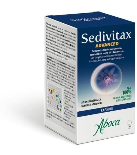 Aboca Sedivitax Advanced è un integratore studiato per migliorare la qualità del sonno e contemporaneamente ridurre il tempo necessario per addormentarsi. Il suo utilizzo aiuta a ridurre la tensione e irritabilità se assunto durante il giorno.Se la nostra qualità del sonno non è ottimale possiamo sentirci molto spesso nervosi, spossati e stanchi. Attraverso l'utilizzo dell'integratore Aboca Sedivitax Advanced sarà possibile migliorare la qualità del sonno e ridurre la tensione, irrequietezza e irritabilità durante il giorno. Inoltre, grazie alla presenza della passiflora, l'integratore aiuta a ridurre le tempistiche per addormentarsi. Sedivitax Advanced è un integratore alimentare indicato per i soggetti che hanno difficoltà nell'addormentarsi e/o nella qualità del proprio sonno. Inoltre, grazie alla presenza della valeriana l'integratore è indicato anche per promuovere la buona qualità del sonno notturno. Assunta di giorno può ridurre tensione, irrequietezza e irritabilità. La sua formulazione è stata studiata per favorire l'addormentamento e il riposo riducendo eventuali periodi di tensione, irrequietezza e irritabilità. Tutti gli estratti presenti all'interno dell'innovativa formulazione sono stati ottenuti grazie ad un esclusivo processo tecnologico Liquid-hase Microextraction. La formulazione contiene: Passiflora: favorisce l'addormentamento e un riposo sereno.Valeriana: favorisce una buona qualità del sonno.Melissa: svolge un'azione rilassante e riduce la tensione, irrequietezza e irritabilità Assumere 2 o 3 capsule alla sera per facilitare il sonno e migliorarne la qualità;Assumere 1 capsula al mattino per promuovere il rilassamento durante la giornata. Poiché l'effetto può variare a seconda della sensibilità individuale, si consiglia di iniziare assumendo la dose minima giornaliera, aumentandola in base alla propria necessità.Non superare la dose giornaliera consigliata.Tenere fuori dalla portata dei bambini al di sotto dei 3 anni di età.Gli integratori alimentari non vanno intesi come sostituti di una dieta variata ed equilibrata e di uno stile di vita sano. Valori mediper dose minima2 capsuleper dose massima4 capsuleComplesso molecolare naturale: - Passiflora foglie e.s. tit. in flavonoidi tot. espressi come vitexina 10% - Valeriana radice concentrato tot. tit. in acidi valerenici 0,20% - Melissa foglie e.s. - Biancospino sommità fiorite concentrato tot.961,2 mg 310,7 mg 31,1 mg 363 mg 0,7 mg 16,5 mg 271 mg1.922,4 mg 621,4 mg 62,2 mg 726 mg 1,4 mg 33,0 mg 542 mg Valeriana (Valeriana Officinalis) Radice Polvere, Passiflora (Passiflora Incarnata) Foglie Estratto Secco*, Biancospino (Crataegus Monogyna) Sommità Fiorite Polvere*, Gelatina, Biancospino (Crataegus Monogyna) Sommità Fiorite Estratto Secco*, Melissa (Melissa Officinalis) Foglie Estratto Secco*, Aroma Naturale Di Lavanda, Valeriana (Valeriana Officinalis) Radice Estratto Secco. Senza Glutine. ...