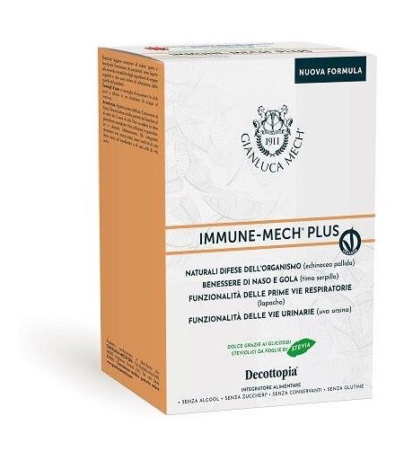 Decottopia Immune-Mech Plus Edulcorante alimentare a base di estratti acquosi di piante officinali con edulcorante. Echinacea pallida: naturali difese dell'organismo. Antiossidante. Timo serpillo: benessere di naso e gola. Regolare motilità gastrointestinale. Lapacho: funzionalità delle vie respiratorie. Uva ursina: funzionalità delle vie urinarie. Uncaria: funzionalità articolare. Ingredienti Estratto acquoso di erbe amare 70%: echinacea [Echinacea pallida (Nutt.) Nutt.] radice, uncaria [Uncaria tomentosa (Willd. ex Schult) DC.] corteccia, uva ursina (Arctostaphylos uva ursi L. Spreng.) foglia, lapacho [Handroanthus impetiginosus (Mart. ex DC) Mattos] corteccia, eucalipto (Eucalyptus globulus Labill.) foglia, drosera ramentacea (Drosera ramentacea Burch ex DC) parte aerea, timo serpillo (Thymus serpyllum L.) foglia, ribes nero (Ribes nigrum L.) foglia, crescione (Nasturtium officinale R. Brown) parte aerea, ...