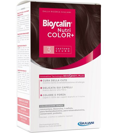 Bioscalin Nutri COLOR+ 3 - CASTANO SCURO - Descrizione Colorazione permanente che grazie alla Tecnologia RevoSensyl - Plus e all'eliminazione dei più comuni sensibilizzanti (senza ammoniaca resorcina para - fenilediammina para - toluendiammina L - naftolo conservanti profumo) consente ancor… ...