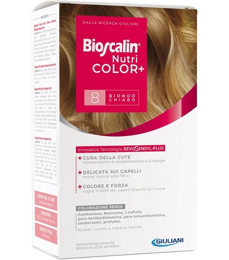 Bioscalin Nutri COLOR+ 8 - BIONDO CHIARO - Descrizione Colorazione permanente che grazie alla Tecnologia RevoSensyl - Plus e all'eliminazione dei più comuni sensibilizzanti (senza ammoniaca resorcina para - fenilediammina para - toluendiammina L - naftolo conservanti profumo) consente ancor… ...