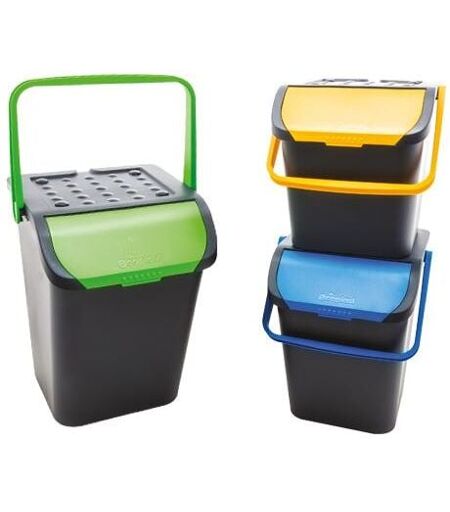 Pattumiere antirandagismo doppia apertura raccolta differenziata Contenitore in polipropilene, manico con chiusura antirandagismo, doppia apertura (superiore con coperchio piano e con sportello frontale ) sovrapponibile con sistema antiscivolo e impilabile. 35 Lt. - 38x36xH45 cm. ...