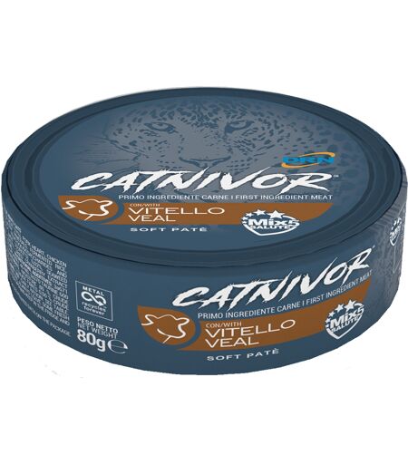CATNIVOR ® – Alimento completo umido per gatti adulti, con la consistenza di un morbido paté. Tutti con carne come primo ingrediente per soddisfare i fabbisogni nutrizionali di un vero carnivoro come il gatto! CATNIVOR ® by DRN è integrato con: **Taurina: aminoacido essenziale per la sua nutrizione, è necessario per lo sviluppo del cervello, il mantenimento della normale struttura retinica e la corretta funzione cardiaca. **Mirtillo rosso: integrazione specifica per la funzionalità del suo apparato urinario. **Prebiotici: per la salute di intestino e sistema immunitario. **Olio di Krill: fonte di acidi grasso Omega 3, facilmente assimilabili, per prendersi cura del suo cuore. **Alghe: supporto alla vitalità dell’organismo grazie alla naturale azione rigenerante dei loro principi nutritivi. ...