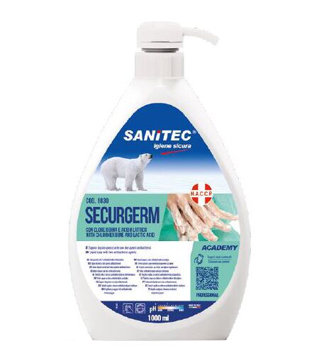 SECURGERM - Descrizione Sapone liquido sanificante per la pulizia profonda delle mani, con 2 principi attivi antibatterici, clorexidina e acido lattico. Indicato nei settori ove sia importante associare la detergenza ad una completa pulizia quali: ospedaliero, agroalimentare, H.a.c.c.p. e altro. - … ...