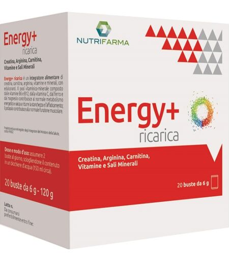 Energy+ ricarica - Descrizione Integratore alimentare di creatina, carnitina, arginina, NAC, vitamine e minerali, con edulcoranti. Gusto arancia. Ingredienti Edulcorante: maltitolo; creatina, L - arginina; acidificante: acido citrico; potassio citrato, carbonato di magnesio, aroma, L - carnitina ta… ...