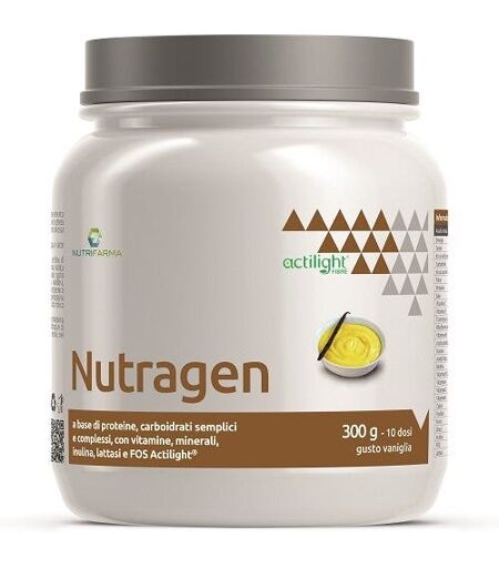 NUTRAGEN Integratore alimentare a base di proteine, carboidrati semplici e complessi, con vitamine minerali, inulina, lattasi e FOS Actilight. Gusti: cioccolato, vaniglia. Ingredienti Fruttosio, proteine del siero di latte concentrate (contengono emulsionante: lecitina di soia), maltodestrine, cacao parzialmente sgrassato in polvere, inulina4%, frutto-oligosaccaridi (FOS) 2%; addensante: carbossimetilcellulosa sodica; calcio fosfato tribasico, cloruro di sodio, premiscela vitaminica [vitamina C (acido L-ascorbico; stabilizzante: etilcellulosa), vitamina E (DL-alfa-tocoferile acetato, nicotinamide, calcio D-pantotenato), vitamina A (retinile acetato), vitamina D (colecalciferolo), vitamina B6 (piridossina cloridrato), vitamina K (fillochinone), vitamina B1 (tiamina cloridrato), vitamina B2 (riboflavina), acido folico (acido pteroilmonoglutammico), vitamina B12 (cianocobalamina), D-biotina]; emulsionante: lecitina di girasole; aromi, ...