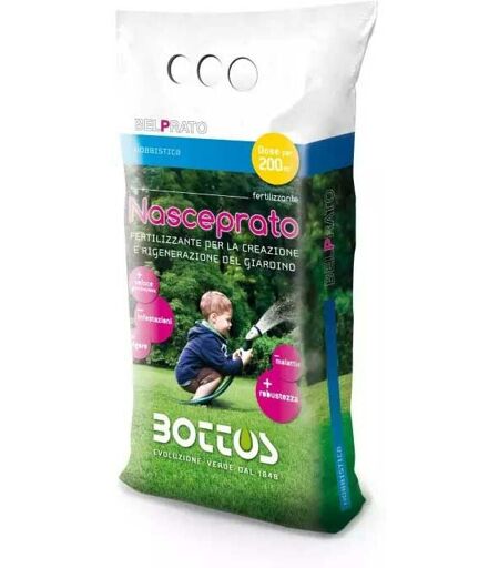 Concime Nasceprato Bottos ideale per semine e trasemine. Garantisce una veloce germinazione, minori infestazioni, maggiore vigore, minori malattie e più robustezza. Utile anche per l'attecchimento del prato a rotoli. Composto da un rapporto NPK (Azoto, Fosforo, Potassio) di 10-20-0. La presenza di Fosforo solubile ed assimilabile favorisce un rapido radicamento delle giovani plantule, garanzia di buona riuscita della semina del tappeto erboso. Nasceprato è indicato per le semine ex-novo, le trasemine e le rigenerazioni sia nel verde sportivo sia nei tappeti erbosi ricreativi. Questo prodotto è anche molto utile per velocizzare l'attecchimento del prato a rotoli. Dosaggio: 25-35 g/mq - Sacco da 5kg. ...