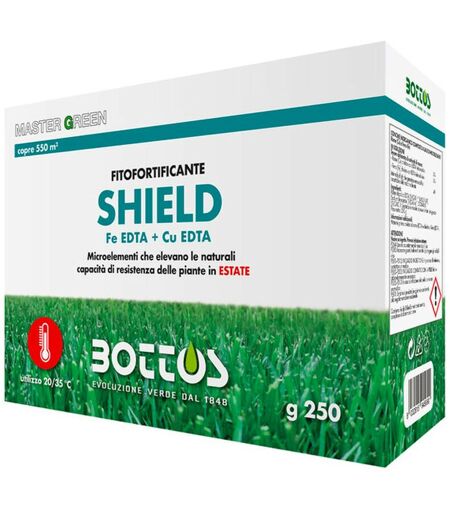 BOTTOS - SHIELD / 250 gr - Concime liquido per prato Concime liquido composto da Ferro e Rame chelati. Adatto per nutrire e rafforzare il tappeto erboso. Migliora l'attività di fotosintesi e ha immediato effetto colore. Può essere assorbito per via fogliare e radicale. BOTTOS - SHIELD / 250 gr - Concime liquido per prato Shield è un prodotto Bottos della linea MASTERGREEN, composto da Ferro e Rame entrambi sotto forma chelata. Ferro e Rame sono tra di loro antagonisti, e quindi di difficile coesistenza nell’assorbimento da parte delle piante, per questo è bene distribuire un prodotto che contenga tutti e due gli elementi, al fine di fornire un supporto corretto alla nutrizione. Il Rame svolge anche evidente azione indiretta di protezione ed insieme al Ferro partecipa all’importante fenomeno d’induzione di resistenza: le piante imparano a difendersi da sole da eventuali fisiopatie e difficoltà ambientali. Questo concime è studiato per la nutrizione tecnica dei tappeti erbosi. Shield, ...