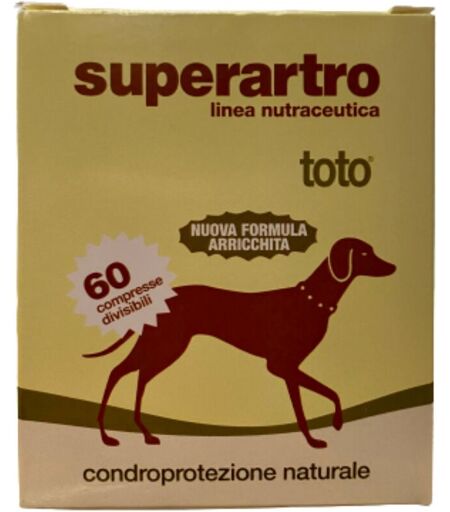 Toto Superartro – Integratore Naturale per Articolazioni del Cane Dona benessere e mobilità al tuo cane con Toto Superartro, l’integratore naturale studiato per supportare le articolazioni di cani giovani, anziani, sportivi o soggetti a displasia e artrosi. Formulato con materie prime di altissima qualità, Toto Superartro favorisce il mantenimento della funzione articolare e contrasta l’invecchiamento delle cartilagini, migliorando la qualità di vita del tuo cane in modo sicuro e naturale.✅ Ideale per: Cani anziani con difficoltà motorie o artrosi Cani giovani e attivi sottoposti a stress articolare (sport, lavoro, addestramento) Soggetti predisposti a displasia dell’anca o del gomito Cuccioli in crescita per uno sviluppo articolare corretto Principi attivi naturali e benefici Condroitina solfato & Glucosamina – Proteggono e rigenerano la cartilagine articolare MSM (Metilsulfonilmetano) – Azione antinfiammatoria naturale Curcuma e Boswellia – Supportano la flessibilità e riducono rigidità e dolore Omega 3 EPA/DHA – Effetto antiossidante e protettivo sulle articolazioni Vantaggi di Toto Superartro ✔ 100% naturale, senza additivi chimici ✔ Supporto articolare completo in un unico prodotto ✔ Facile da somministrare: appetibile e ben tollerato ✔ Prodotto in Italia con ingredienti di qualità premium Composizione:• D-glucosamina (25%), • Perna Canaliculus (molluschi essiccati 24%), • Lievito di birra secco, • Condroitin solfato (8%), • Olio di pesce, • maltodestrine, • Amido di mais, • PEA (palmitoiletanolamide), • acido jaluronico. Additivi (per kg): Additivi nutrizionali:- Vit. E (tutto-rac-alfa-tocoferile acetato) 40.000 mg, - Vit. C 23.000 mg. Additivi tecnologici:- Cellulosa microcristallina 40.000 mg, - Silice colloidale 26.000 mg, - Magnesio stearato 10.000 mg. Componenti analitici:• Proteina grezza 18,0%, • Olii e grassi grezzi 9%, • Fibra grezza 5,0%, • Ceneri grezze 9,0%, • Acidi grassi Omega-3 3,3%. .Confezione da 60 compresse. Modalità d’uso 1 compressa ogni 15 kg di peso corporeo al giorno. Si consiglia la somministrazione del prodotto per 4/6 settimane; il trattamento va ripetuto 3/4 volte l’anno. Attenersi ai consigli del Medico Veterinario.❓ Domande frequenti (FAQ) Va bene per cuccioli? Sì, può essere utilizzato anche nei cuccioli di razze predisposte a problemi articolari per favorire uno sviluppo sano. Deve essere somministrato a vita? No, ma cicli regolari (2-3 mesi) sono consigliati nei soggetti predisposti o con problematiche croniche. Ha effetti collaterali? No, la formulazione è naturale e ben tollerata. Si consiglia comunque di consultare il veterinario per casi specifici. Ordina ora Toto Superartro Migliora la mobilità del tuo cane con un integratore sicuro, naturale e di qualità. Spedizione veloce in tutta Italia. Pagamento anche alla consegna. ...