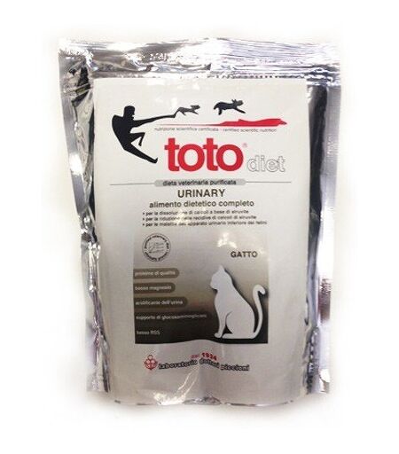 1,5 Kg - Toto Diet Urinary per Gatti – Alimento Secco Dietetico.Toto Urinary è un alimento secco dietetico completo pensato per supportare i gatti nella gestione dei calcoli di struvite e delle patologie dell’apparato urinario inferiore .Grazie alla bassa concentrazione di magnesio ⚖️ e alle proprietà acidificanti dell’urina , questo mangime:✅ Favorisce la dissoluzione dei calcoli a base di struvite,✅ Aiuta a ridurre le recidive di calcoli,✅ Supporta la salute urinaria nei gatti sensibili. Formati disponibili: 1,5 Kg. Prodotto in Italia. Composizione:• Riso micronizzato,• Pollo e tacchino disidratati,• Isolato proteico di soia,• Glutine di frumento,• Glutine di mais,• Aringhe disidratate,• Mais,• Grassi animali (strutto),• Grassi vegetali (olio di soia e di girasole),• Polpa di barbabietola essiccata,• Farina di carrube essiccate micronizzate,• Fruttoligosaccaridi (FOS),• Sali minerali, • Olio di pesce,• Idrolisato di proteine animali,• Fibre vegetali,• Uova intere in polvere,• Polifenoli,• Semi di lino,• Taurina,• Cartilagine marina (glucosamino-glicani). Componenti Analitici:- Proteina grezza: 32,00%,- Oli e grassi grezzi: 14,00%,- Fibra grezza: 2,80%,- Ceneri grezze: 6,20%,- Magnesio: 0,09%,- Cloruri: 0,99%, - Sodio: 0,46%,- Potassio: 0,78%,- Calcio: 0,84%,- Fosforo: 0,60%,- Zolfo: 0,53%. Additivi per Kg.: VITAMINE * Vitamina A 23000 U.I. * Vitamina D3 800 U.I. * Vitamina E 200 mg. AMINOACIDI:DL-metionina 1000 mg/Kg .Taurina 0,25 mg/Kg. OLIGOELEMENTI:• Carbonato ferroso (ferro) 245 mg.(ferro 118 mg.),• Solfato remeico pentaidrato 65 mg.(rame 16,60 mg.),• Ossido manganoso 68 mg.(manganese 52,60 mg.),• Zinco ossido 240 mg.(zinco 192.70 mg.) ,• Jodato di calcio anidro 1,34 mg. (jodio 0,87 mg.),• Selenito di sodio 0,37 mg.(selenio 0,17 mg.) ,Fonti selezionate di proteine: Pollo e tacchino disidratati, isolato proteico di soia, glutine di frumento, glutine di mais, uova, uova intere in polvere. Somministrazione:Somministrare tal quale o leggermente inumidito . Lasciare sempre acqua fresca a disposizione. Si consiglia: 5-12 settimane per la dissoluzione dei calcoli di struvite, Fino a 6 mesi per la riduzione delle recidive, SOMMINISTRAZIONE:peso del gatto in kg.2345678dose di alimento in grammi adulto in attività/crescita40556585100105 dose di alimento in grammi adulto mantenimento354055708595105 Le dosi possono variare in base alla stagione, razza o condizioni fisiche del gatto. Consultare sempre il medico veterinario .❄️ Conservare in luogo fresco e asciutto. ...