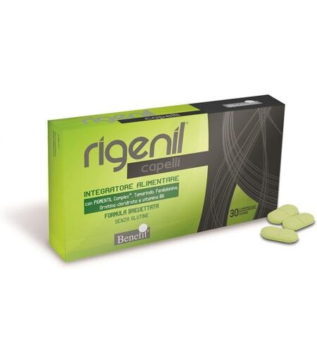 Prenditi cura dei tuoi capelli contrastando la caduta preventiva e ritardando l’invecchiamento con l’integratore alimentare Rigenil Capelli.Rigenil Capelli è un integratore in compresse per il benessere dei capelli che sfrutta l'innovativo Pigmentil complex per ritardarne l'invecchiamento. L'utilizzo dell'integratore Rigenil Capelli è indicato nei casi in cui sia necessario apportare nutrienti aggiuntivi per il benessere del capello. Anticaduta Rigenil Capelli è un integratore pensato per contrastare il processo di invecchiamento delle cellule dei capelli che portano alla formazione di capelli bianchi e una maggiore caduta del capello. La sua formula:Sfrutta il potenziale dell'innovativo Pigmentil complex con Tamarindo Indicus, Fenilalanina-L, Ornitina per ritardare l'invecchiamento capillare;Riduce la formazione di capelli bianchi ostacolando la depigmentazione;Riduce la caduta dei capelli;Rafforza la struttura capillare. Assumere 1 compressa al giorno presa con un bicchiere d'acqua anche a stomaco vuoto. Il trattamento ha una durata consigliata di 3 mesi da ripetere due volte l'anno a distanza di 4-6 mesi. Non superare le dosi consigliate. L'integratore non sostituisce uno stile di vita sano ed equilibrato. Agenti di carica: cellulosa microcristallina, calcio fosfato; Pigmentil Complex [L-fenilalanina, tamarindo (Tamarindus indica L., frutti) estratto secco, L-ornitina cloridrato)]; olio di semi di lino microincapsulato (Linum usitatissimum L. olio, maltodestrine) titolato al 25% in acido alfa-linolenico e al 10% in acido linoleico; stabilizzante: carbossimetilcellulosa reticolata sodica; licopene da pomodoro (Solanum lycopersicum L. frutto estratto secco, amido); agenti di rivestimento: idrossipropilmetilcellulosa, cellulosa microcristallina, acido stearico; glicerolo; antiagglomerante: biossido di silicio; coloranti: biossido di titanio, ossido di ferro, clorofillina rameica; vitamina B6 (cloridrato di piridossina). ...
