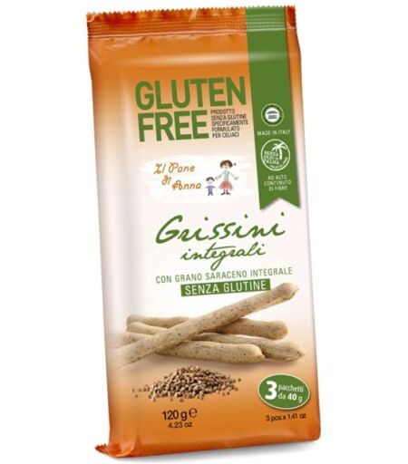 Il Pane di Anna - Grissini integrali - Descrizione Grissini integrali con grano saraceno integrale, ad alto contenuto di fibre. Prodotto senza glutine specificamente formulato per celiaci. Senza olio di palma. Ingredienti Amido di mais, olio di semi di girasole, farina di grano saraceno integrale 4… ...