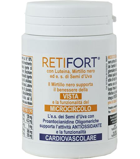 RETIFORT - Descrizione Integratore alimentare a base di estratti vegetali (luteina, Mirtillo nero, estratto secco di semi di Uva con proantocianidine oligomeriche) con azione antiossidante, supporta la funzionalità del microcircolo, contribuisce al benessere della vista, supporta la regolare funzio… ...