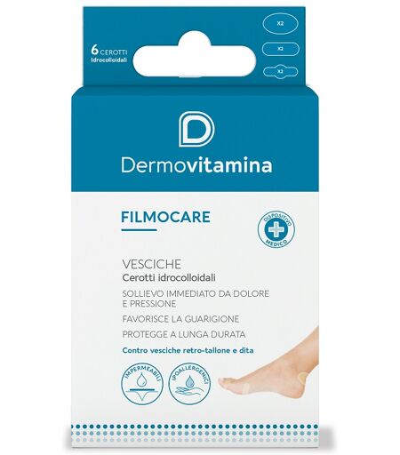 Dermovitamina - FILMOCARE Cerotti VESCICHE - Descrizione Cerotti idrocolloidali. Sollievo immediato da dolore e pressione. Favorisce la guarigione. Protegge a lunga durata. Contro vesciche retro - tallone e dita. - Modalità d'uso Pulire e asciugare con cura la zona interessata disinfettandola se n… ...