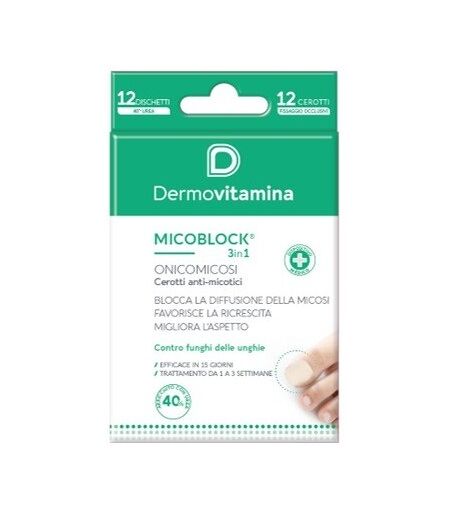 Dermovitamina Micoblock 3in1 Onicomicosi 12 CerottiCerotti Anti Micotici per le micosi delle unghieA cosa serve Dermovitamina Micoblock 3in1 OnicomicosiCerotto raccomandato nellâambito del trattamento topico delle micosi delle unghie di piedi e mani. Il 40% di urea ...