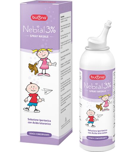 buOna nebial 3% SPRAY NASALE - Soluzione salina ipertonica al 3% con aggiunta di acido ialuronico INDICAZIONI La soluzione salina al 3% è utile per la decongestione delle mucose nasali e ha un effetto fluidificante sul muco; è consigliato per la pulizia quotidiana delle fosse nasali soprattutto in … ...