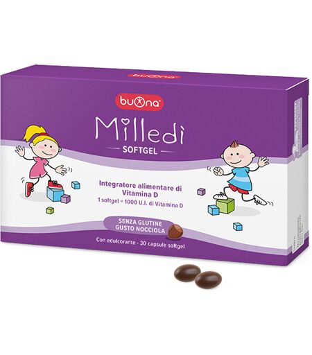 Milledì - SOFTGEL - Descrizione Integratore alimentare di vitamina D3 per la crescita e lo sviluppo osseo nei bambini al gusto nocciola. La vitamina D3 (colecalciferolo) contenuta in milledì contribuisce alla normale crescita e allo sviluppo osseo nei bambini. La vitamina D infatti contribuisce non… ...