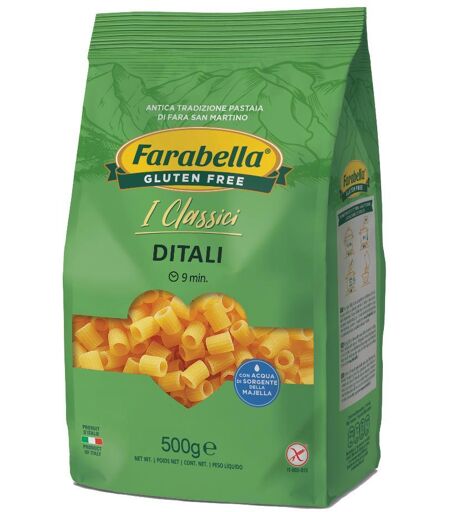 Farabella Pasta - Pasta senza glutine. Formato ditali. Ingredienti Farina di mais; farina di riso; amido di mais. Modalità d'uso Utilizzare una pentola capiente con abbondante acqua: non meno di 3 litri di acqua per 500 g di pasta. Ad ebollizione viva aggiungere circa 5 g di sale grosso per litro d… ...