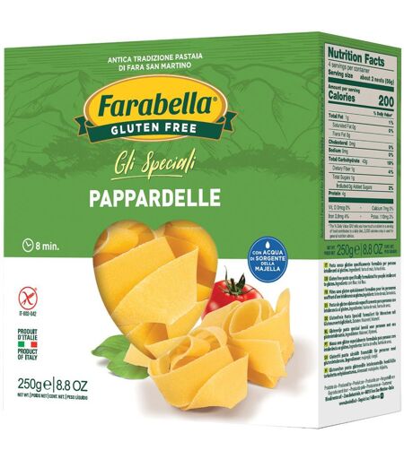 Farabella Pappardelle - Pasta senza glutine. Formato pappardelle. Ingredienti Farina di mais; farina di riso; amido di mais. Modalità d'uso Utilizzare una pentola capiente con abbondante acqua: non meno di 4 litri di acqua per 250 g di pasta. Ad ebollizione viva aggiungere circa 5 g di sale grosso … ...