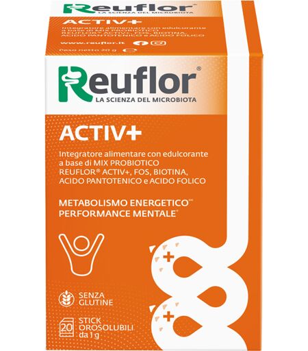 Reuflor ACTIV+ Descrizione Integratore alimentare a base di mix probiotico Reuflor Activ+ (Bifidobacterium animalis subsp. lactis BLC1, Lactobacillus paracasei IMC502, Lactobacillus rhamnosus IMC 501, Lactobacillus paracasei NTU 101) che contribuisce all'equilibrio della flora intestinale. Contiene anche: - frutto-oligosaccaridi (FOS) ad azione prebiotica, biotina che contribuisce al normale funzionamento del sistema nervoso, alla normale funzione psicologica e svolge un ruolo importante nel metabolismo cellulare e nel mantenimento delle mucose normali; - acido pantotenico che contribuisce al mantenimento della normale performance mentale, alla riduzione della stanchezza e dell’affaticamento; - acido folico che favorisce la normale funzionalità del sistema immunitario e contribuisce al normale metabolismo dell’omocisteina. La biotina, l’acido pantotenico e l’acido folico contribuiscono, infine, al normale metabolismo energetico. Ingredienti Mix probiotico Reuflor Activ+ (Bifidobacterium animalis subsp. lactis BLC1, Lactobacillus paracasei IMC502, Lactobacillus rhamnosus IMC 501, Lactobacillus paracasei NTU 101), frutto-oligosaccaridi (FOS), acido pantotenico, acido folico. Senza glutine. Modalità d'uso La dose raccomandata è di uno stick al giorno da assumere direttamente in bocca, preferibilmente a stomaco pieno. Avvertenze Non superare la dose giornaliera consigliata. Tenere fuori dalla portata dei bambini al di sotto dei 3 anni di età. Gli integratori alimentari non vanno intesi come sostituti di una dieta variata ed equilibrata e di uno stile di vita sano. Un consumo eccessivo può avere effetti lassativi. Conservazione Conservare in luogo fresco e asciutto lontano da fonti di luce e calore. La data di fine validità si riferisce al prodotto correttamente conservato in confezione integra. Validità a confezionamento integro: 24 mesi. Formato Confezione da 20 stick orosolubili da 1 g ...
