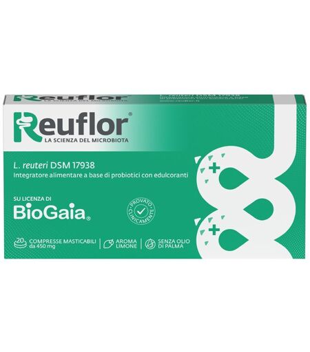 Gli integratori non sostituiscono un’alimentazione equilibrata e variegata e uno stile di vita sano. Reuflor® è un integratore alimentare a base di Lactobacillus reuteri DSM 17938. Lactobacillus reuteri DSM 17938 è un fermento lattico in grado di favorire l’equilibrio della flora intestinale.Lavori scientifici pubblicati dimostrano che Lactobacillus reuteri DSM 17938: è attivo e vitale nelle condizioni ambientali presenti a livello intestinale; è resistente al succo gastrico, alla bile ed al succo pancreatico; è in grado di colonizzare l’intestino umano. Ingredienti:Edulcoranti: isomalto e xilitolo; Lactobacillus reuteri DSM 17938, olio di palma; agente antiagglomerante: sali di calcio degli acidi grassi; aroma limone; esaltatore di sapidità: acido citrico Analisi media Per 2 compresse Lactobacillus reuteri DSM 17938 2 x 108 CFU Modo d'uso:La dose raccomandata è di 1-2 compresse masticabili al giorno, indipendentemente dai pasti. Una compressa contiene non meno di 108 CFU di Lactobacillus reuteri DSM 17938. Per l’utilizzo del prodotto nei bambini di età inferiore ai 3 anni, sentire il parere del medico. Avvertenze: Non superare la dose giornaliera raccomandata. Tenere fuori dalla portata dei bambini al di sotto dei 3 anni di età. Conservazione:Conservare in luogo fresco ed asciutto al riparo dalla luce, dalle fonti di calore localizzate e dai raggi solari ed evitare il contatto con l’acqua. Contenuto netto:20 compresse = 9 g Produttore:Italchimici SpaVia Matteo Civitali, 120148 MilanoItalia ...